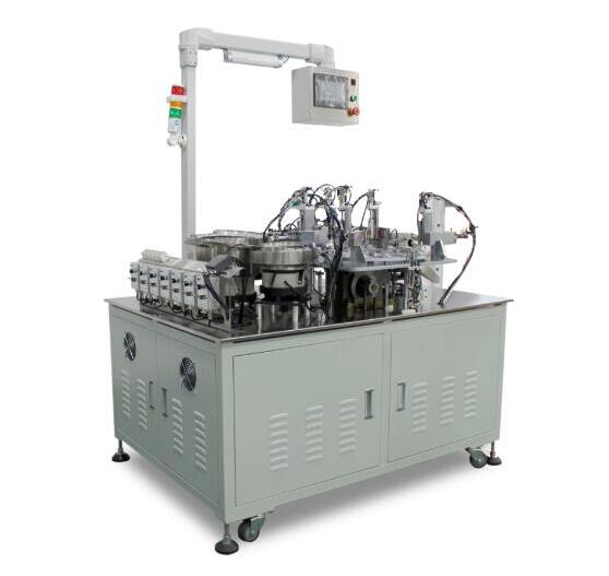 閥門組裝機的優(yōu)勢之處在于,機架頂面上具有閥門裝載器具,在裝載器具的一側(cè)裝備有伺服電機,電機上方有控制箱,閥門裝載器具的后側(cè)裝配了移動滑動組件,可以在移動滑動組件上面設(shè)置具有鎖螺絲的點膠機構(gòu),在機架右端具有上料機構(gòu)。